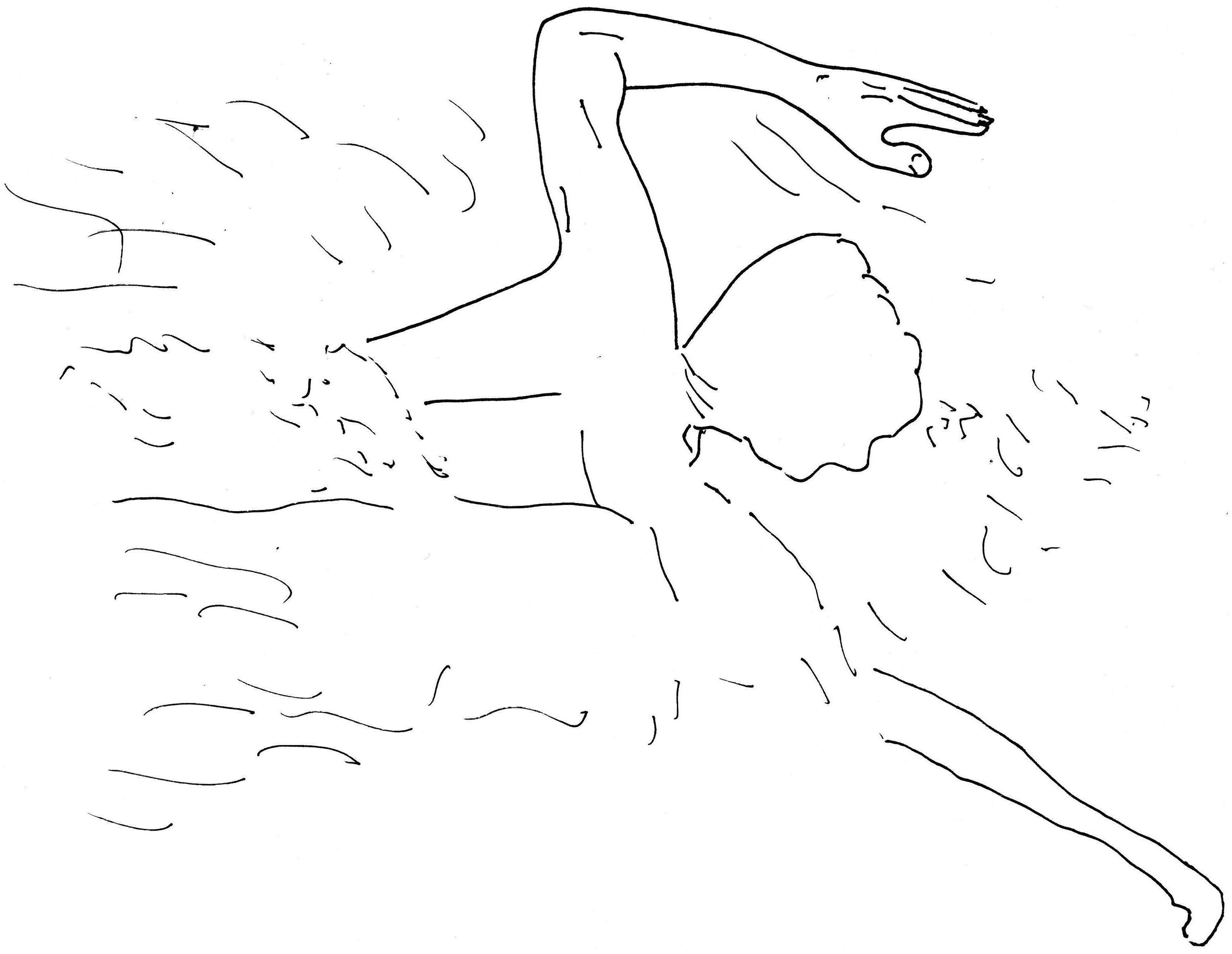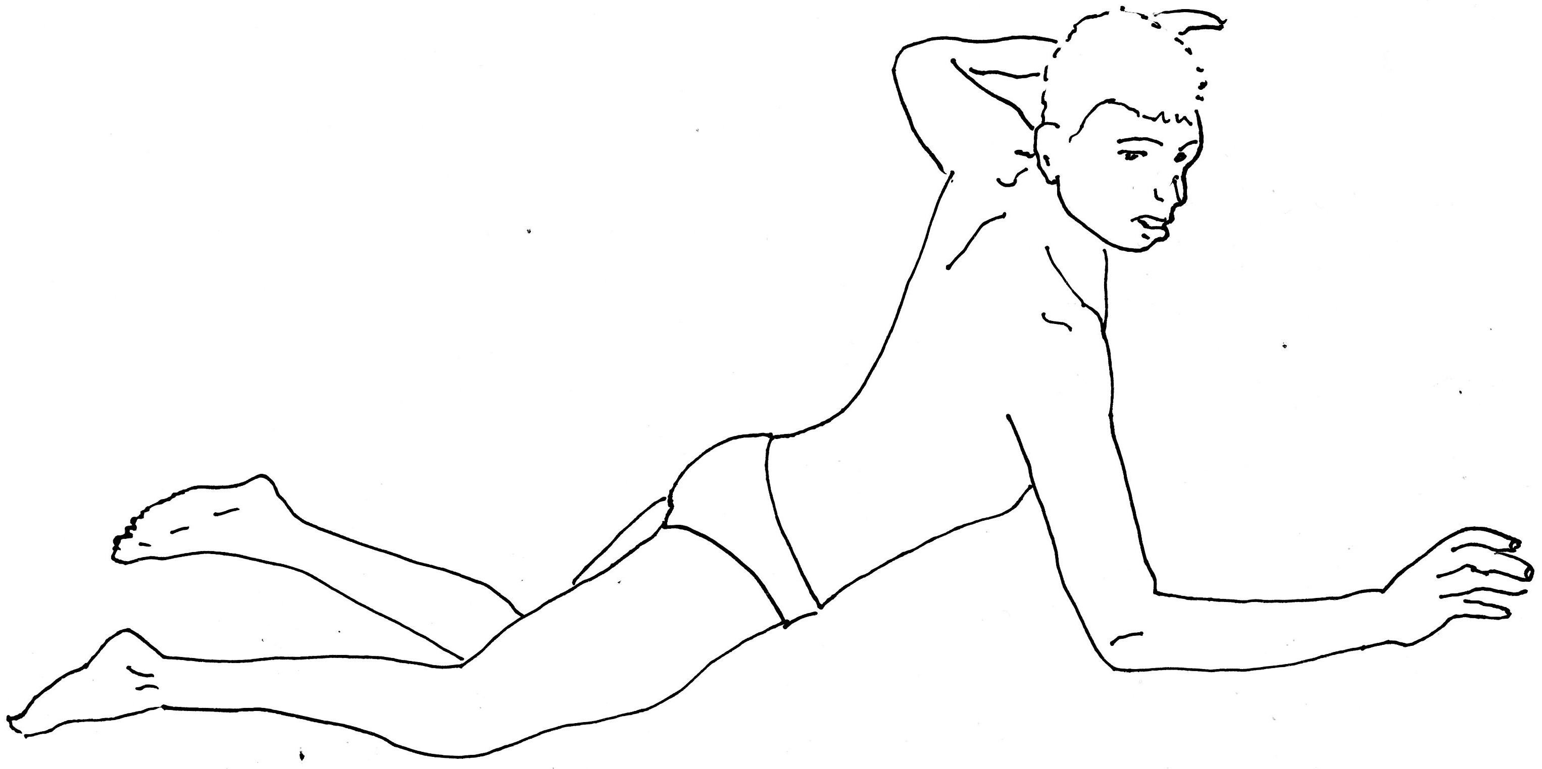 The prone boy jumps up and begins to dance with me. Doug and the other boys join us. Soon everyone is whooping and hollering around the teepee. Without a signal, they grab my arms and legs and carry me over their heads. Out of the teepee and into the pool I go, followed by all the others. I feel released into my own element and begin doing somersaults in the deep end. The others sit on the side, watching my water antics. I feel like Flipper.