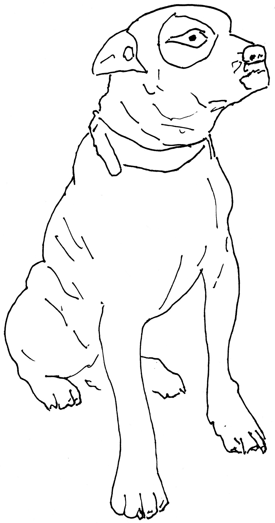 “Come here, Max,” I order. The dog half-rises to his feet. Before he is fully up, he tries walking, falling all over himself. Everyone breaks up and the dog does a passable imitation of Spot, the Our Gang dog, with its paw over its eyes. More laughs. Max slinks into the corner.