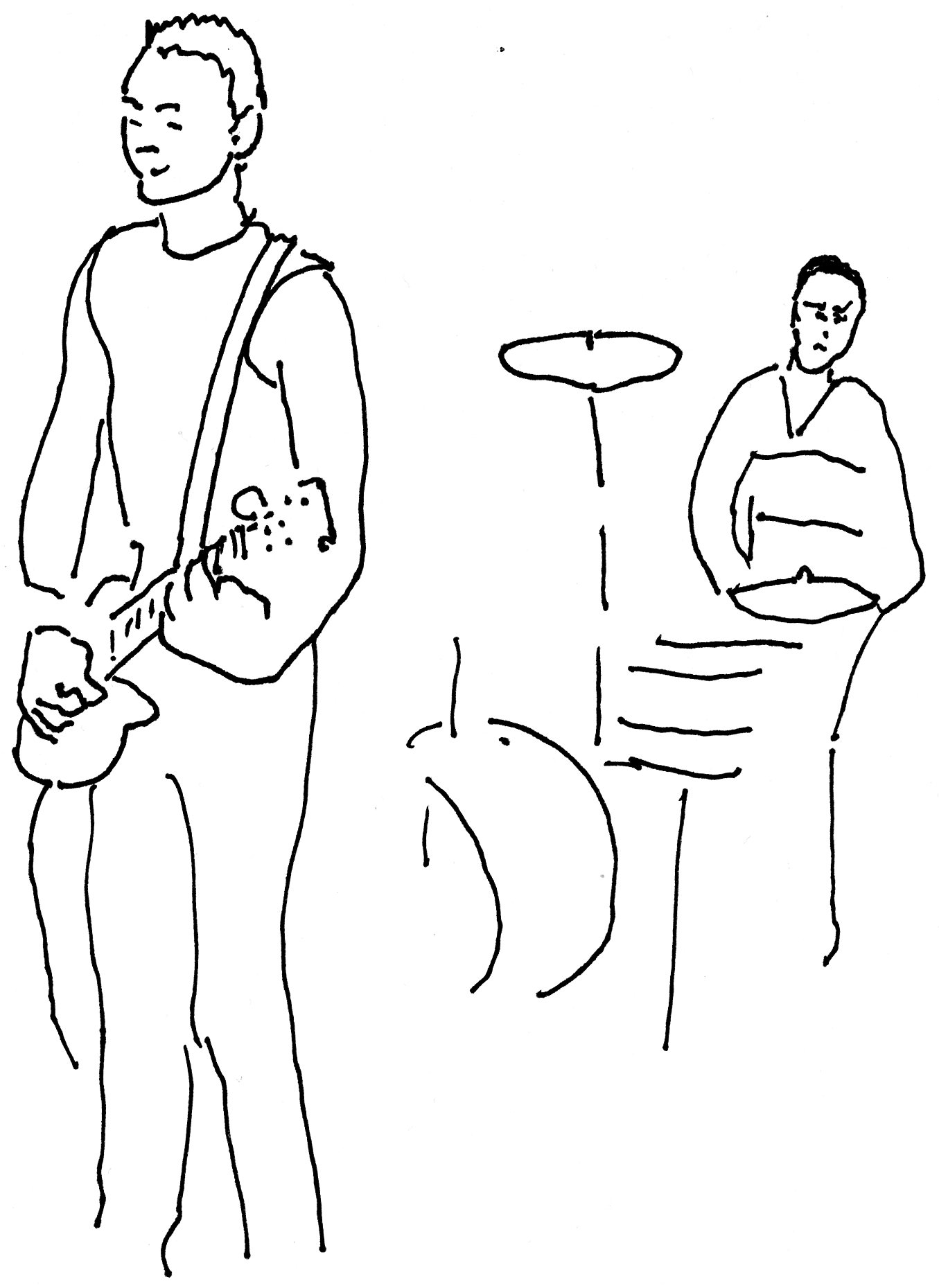 He tunes the synthesizer to his own music. The boys pick up guitars