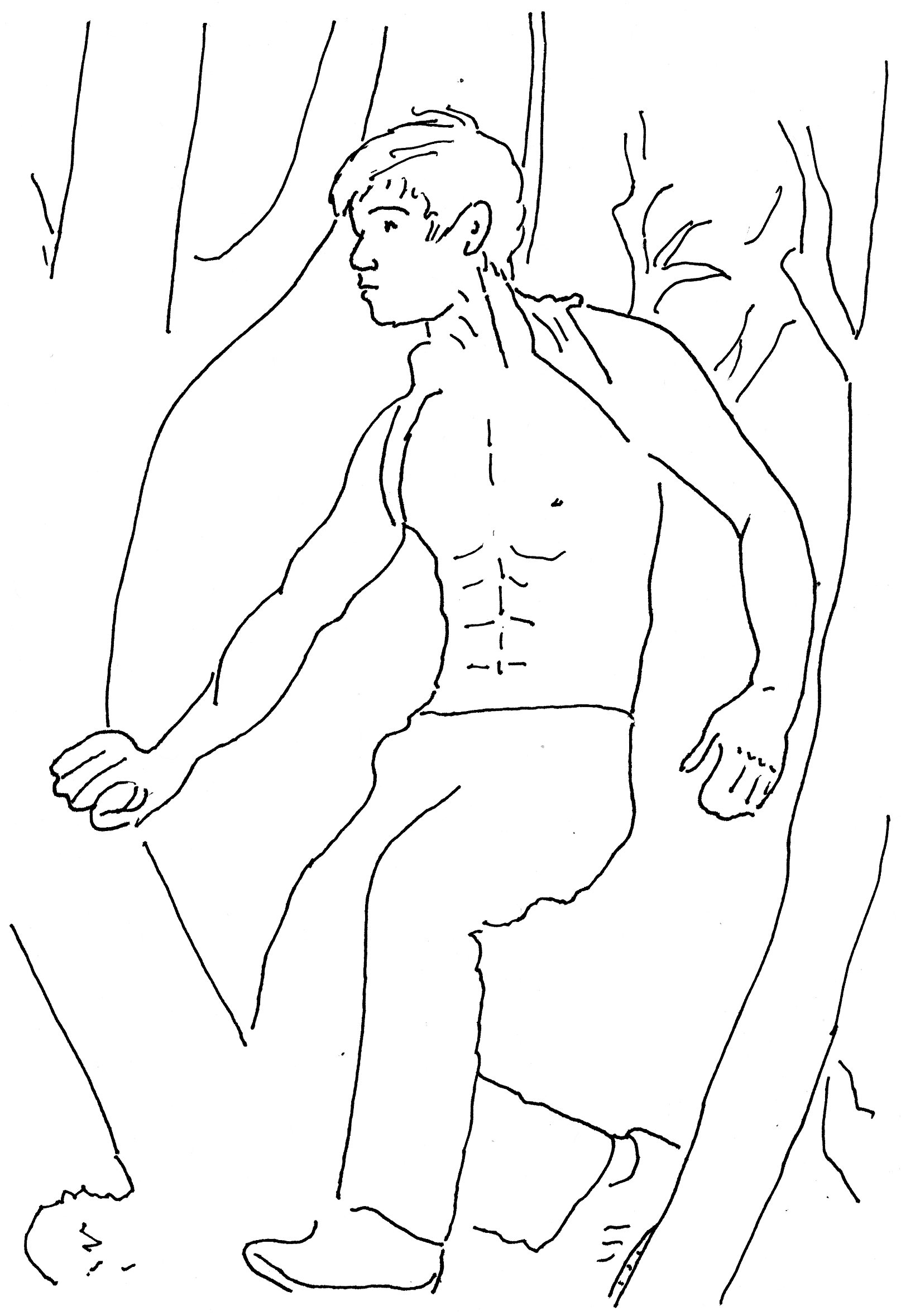 He starts running home. I follow, after telling George to meet us at Nutrition the next day. Once we pass Bird Road, Robby is up into the trees, swinging branch to branch toward his house. I try to follow but cannot keep up. He comes back to me,