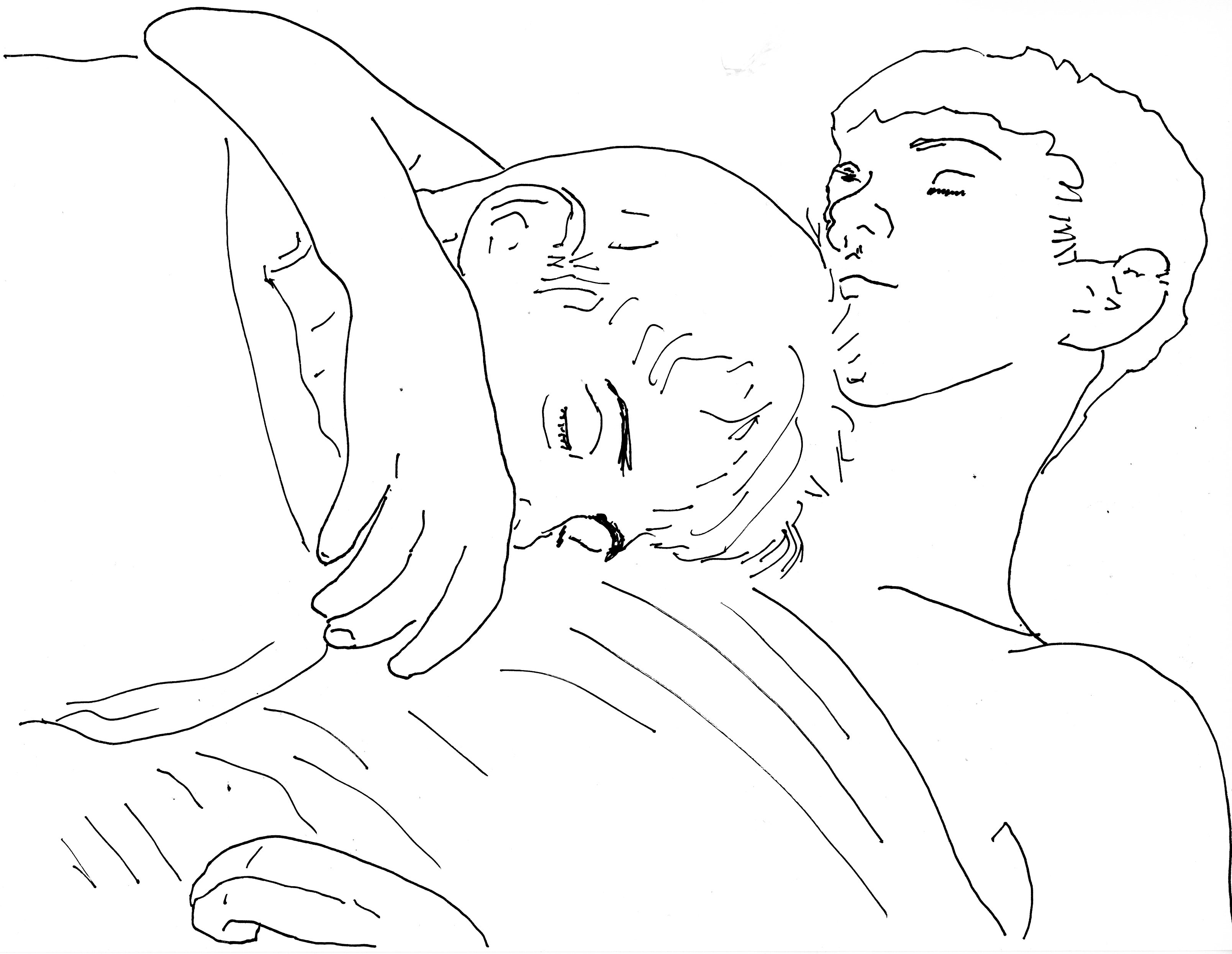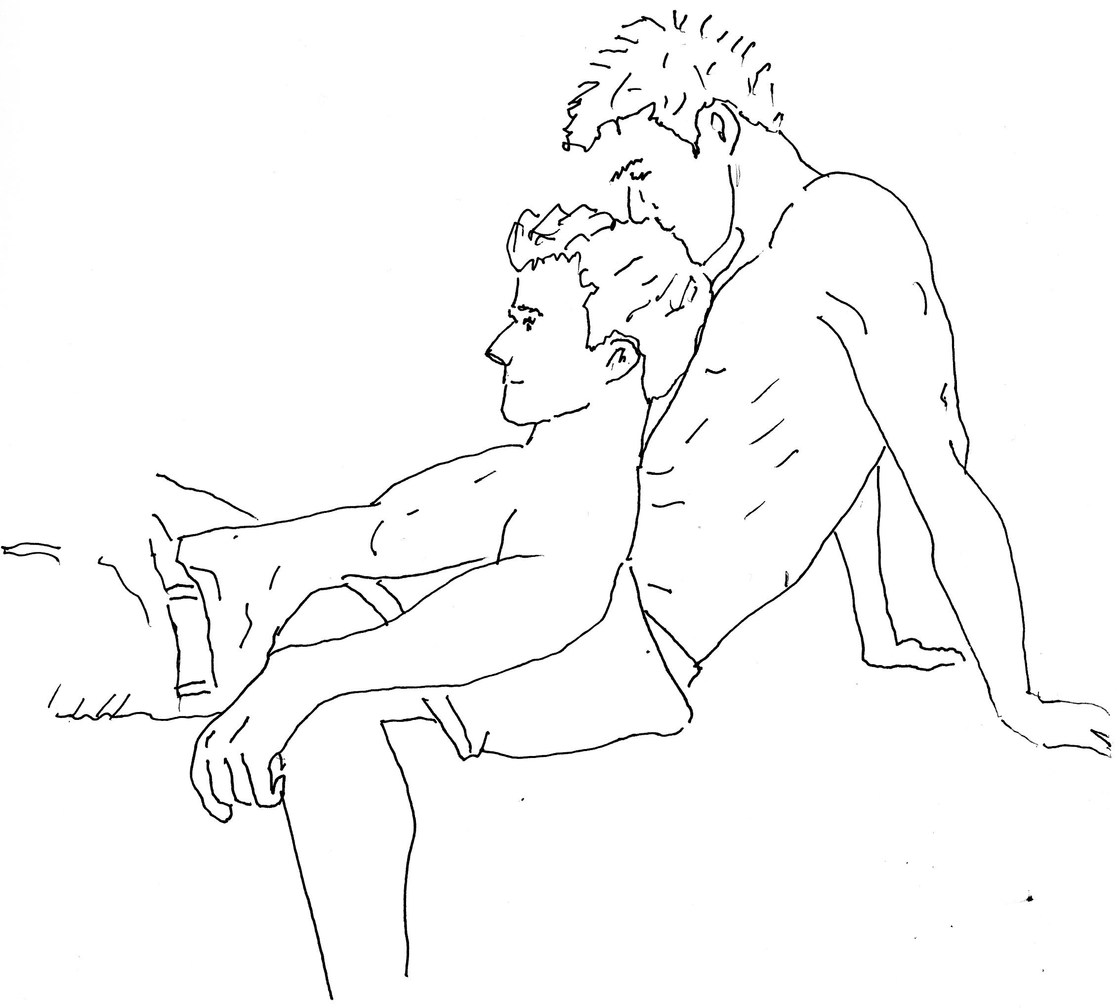 We shower. Max sleeps with us that night. I smell so much like Jace that he acts like we’re both his keeper. In the morning we walk Max back to the garage. When we get to the street, he tugs us to Robby’s and barks at Robby’s window. A sleepy face appears and tosses me a joint, saying it is for Max, not us. We proclaim he will get every hit, second-hand. Walking to the garage, a car drives by and recognizes us from the party, shouting as they drive by, “False Gods. False Gods.”