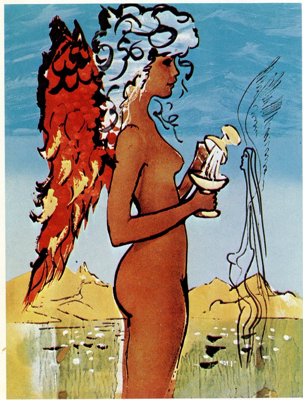 with a new series of lithographs by Salvador Dali. The show’s title is ‘Love’s Trilogy.” It is surreal. Tony and I are laughing at the first painting, a naked girl with wings on fire in deep earth tones. She faces an ink drawing of a Picasso-like woman with distorted features.